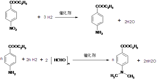 | 2 | 4m3二甲氨基苯甲酸乙酯(苯佐卡因)反應(yīng)釜:采用自吸式攪拌機(jī)后,在其他工藝條件不變的情況下,后一步加氫時(shí)間由原來的16小時(shí)縮短到10小時(shí)左右,而且我們?cè)谏a(chǎn)過程中發(fā)現(xiàn)催化劑的使用了下降,每投一次催化使用時(shí)間比原來使用要長(zhǎng),統(tǒng)計(jì)后平均每釜料大約能節(jié)約30%的催化劑用量。 反應(yīng)釜規(guī)格:3m3(ZX-3) 50°C 操作壓力:0.7MPa 主反應(yīng)方程式: ![]() |