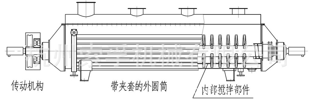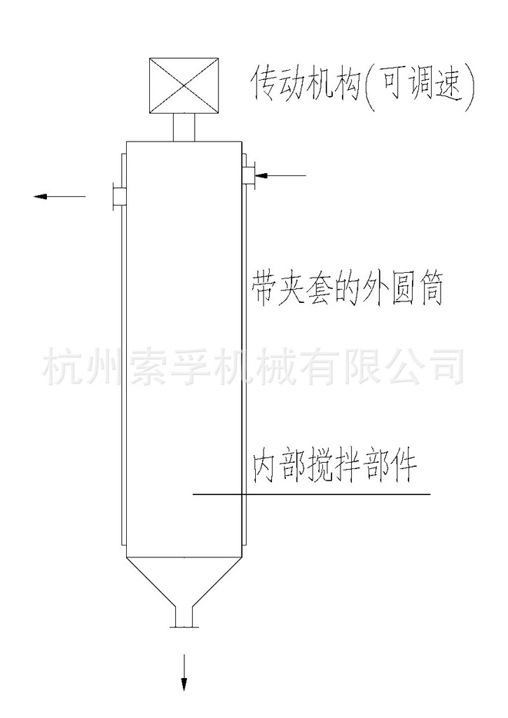 針對(duì)從低粘到中等粘度的流體進(jìn)行濃縮過程,索孚機(jī)械公司開發(fā)了刮板式蒸發(fā)濃縮設(shè)備。這種設(shè)備有一個(gè)加熱的圓筒,內(nèi)部裝有一個(gè)攪拌設(shè)備,通過攪拌的作用使產(chǎn)品沿圓筒壁形成薄膜,提高了氣液相接觸面積,縮短了氣相通道,同時(shí)解決了物料的粘壁問題,以及普通的薄膜蒸發(fā)器難以實(shí)現(xiàn)的粘性流體處理過程。