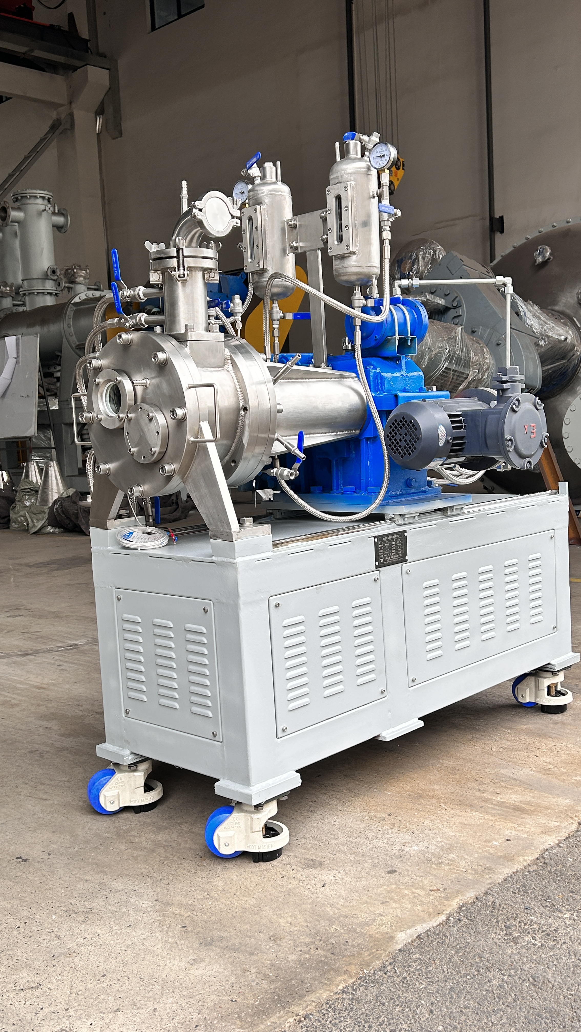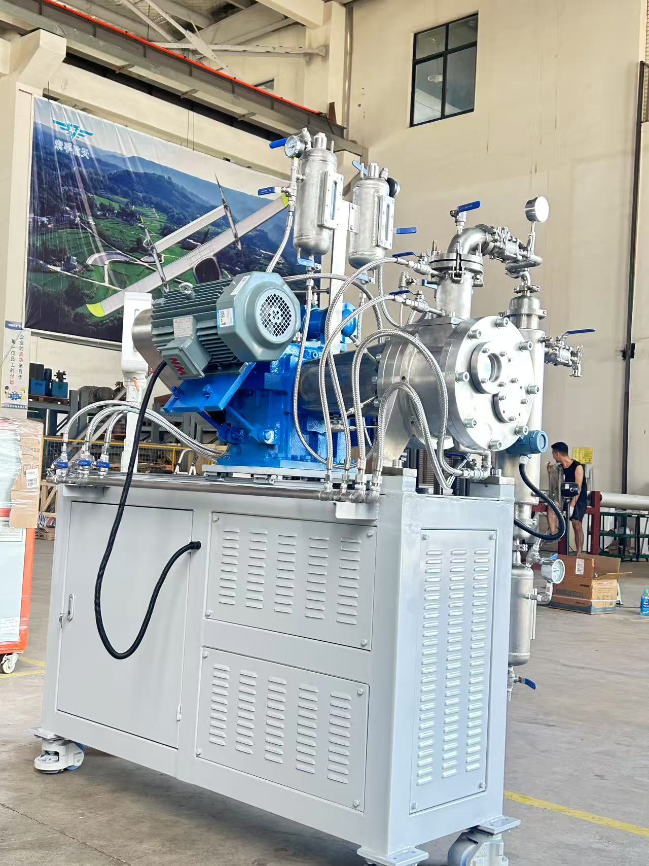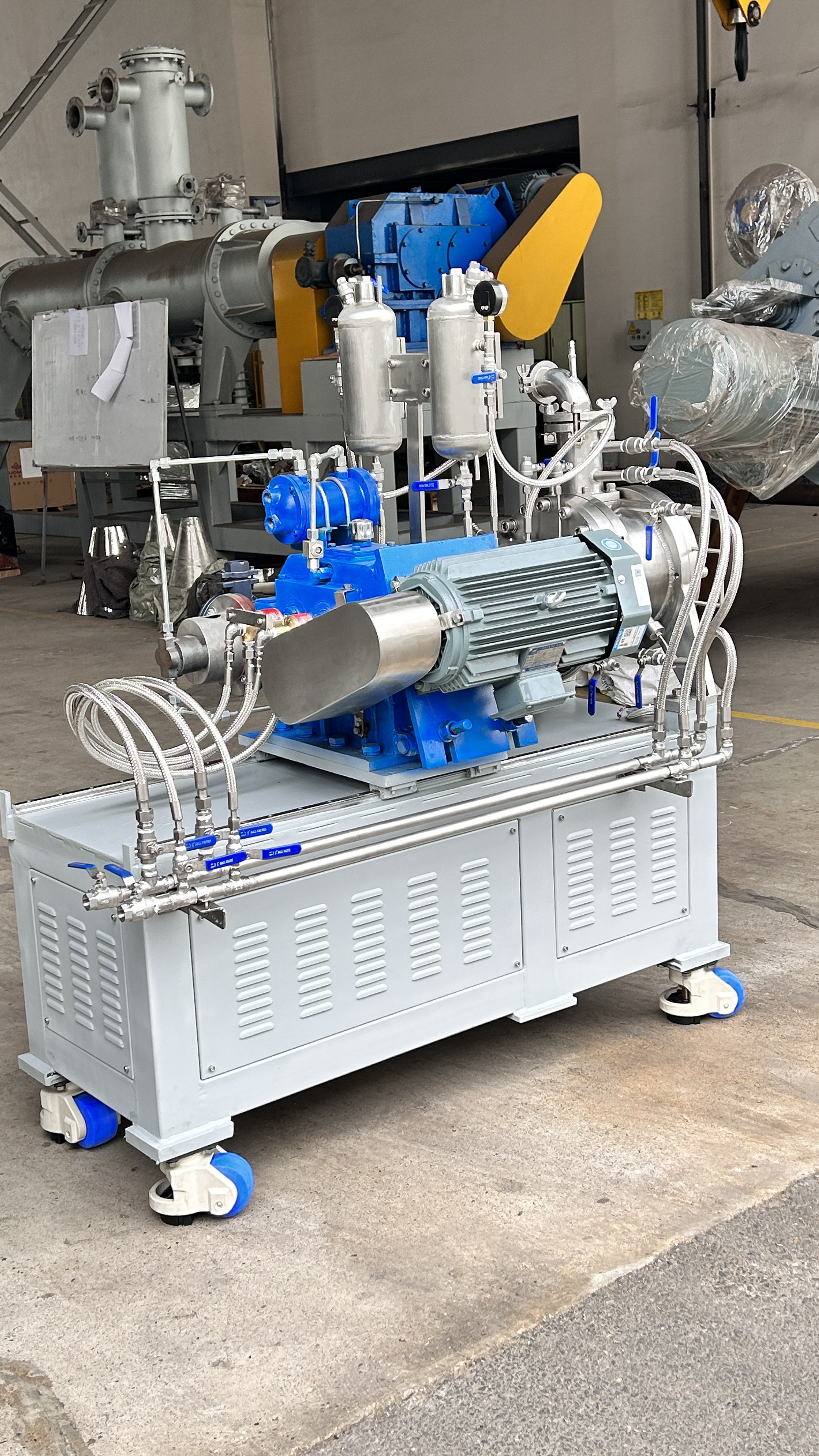 為了適應(yīng)在真空狀態(tài)下的操作,專門安裝了適用于高粘度物料的齒輪泵式出料器。該出料器直接安裝在主設(shè)備上,消除了設(shè)備內(nèi)的死角。齒輪泵式出料器在稍微超負荷的條件下工作,以保證物料能連續(xù)地排出,并輸入下一工段進行包裝。