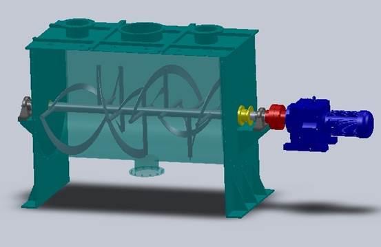 臥式螺帶混合機(jī)由安裝于攪拌軸上的內(nèi)外徑螺旋帶動(dòng)桶體內(nèi)物料,使攪拌器在桶體內(nèi)較大范圍翻動(dòng)物料。攪拌器結(jié)構(gòu)上,螺旋設(shè)計(jì)成內(nèi)外、左右互為反螺旋,攪拌器工作時(shí)內(nèi)螺旋帶動(dòng)靠近軸心處物料做軸心旋轉(zhuǎn),軸向由內(nèi)至兩側(cè)推動(dòng),外螺旋帶動(dòng)靠近桶壁物料做軸心旋轉(zhuǎn),軸向由兩側(cè)至內(nèi)推動(dòng),于是造成物料在桶體內(nèi)對(duì)流循環(huán)、剪切滲混,完成物料在較短時(shí)間內(nèi)快速均勻混合。