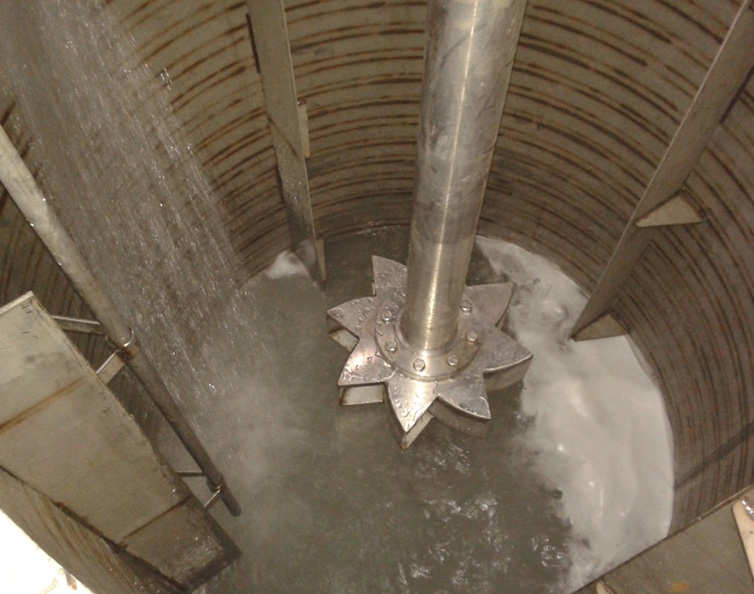 3. 利用自吸葉輪下方的曝氣葉片迅速的槳?dú)庖夯旌象w進(jìn)一步的剪切破碎,細(xì)化氣泡直徑;