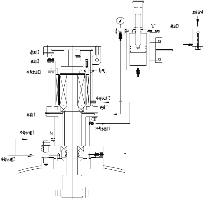 1、在密封隔離套內(nèi)的軸承下端設(shè)置一套專有技術(shù)的機械密封系統(tǒng),將軸承完全密封在稀油潤滑油腔中,外接特制的壓力平衡、補油系統(tǒng)。