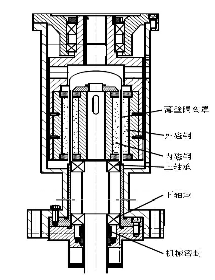 結(jié)構(gòu)組成:有聯(lián)軸器、機架、外磁鋼、內(nèi)磁鋼、隔離套、軸承、機械密封(封閉潤滑油腔)、攪拌軸。