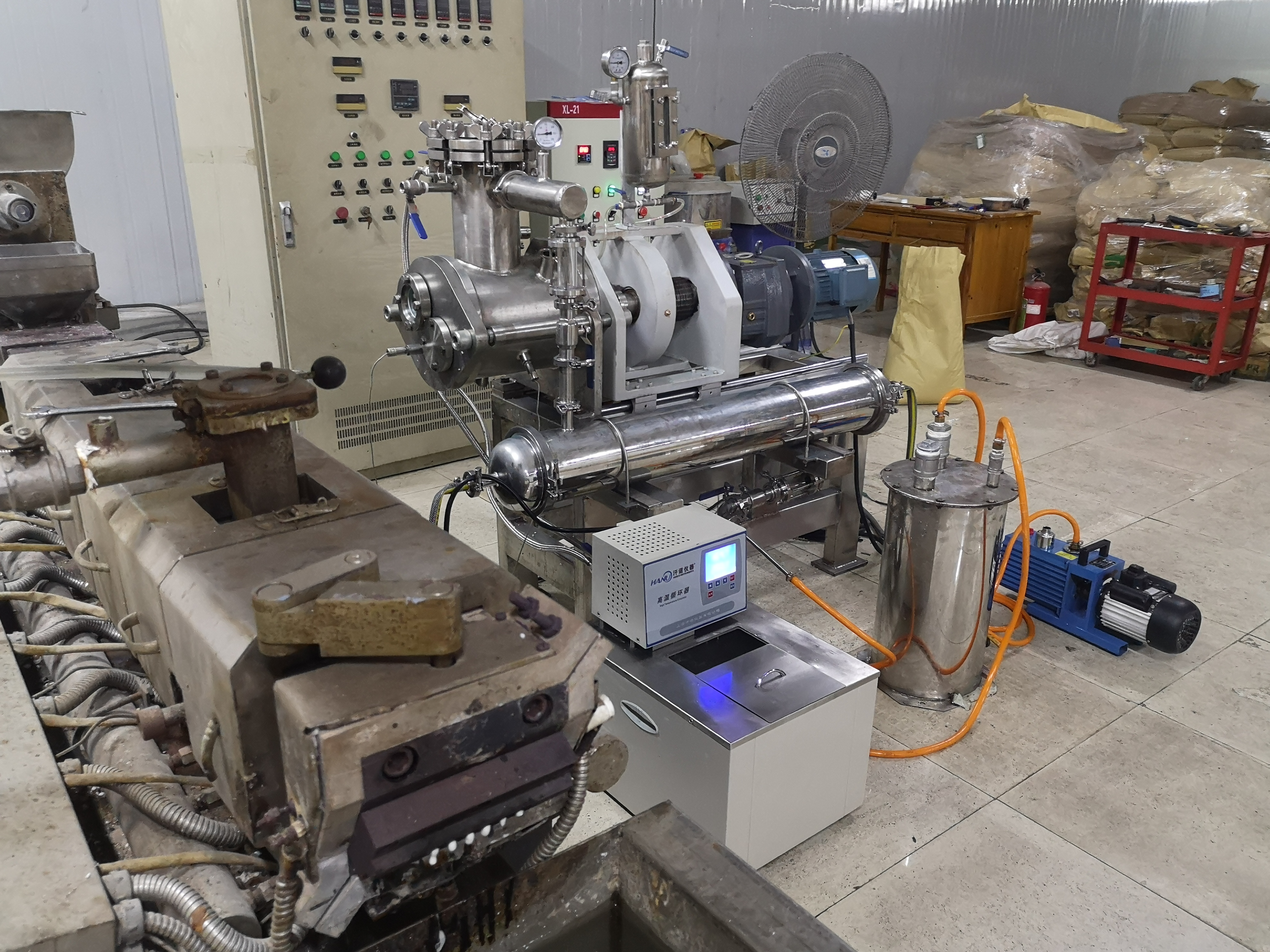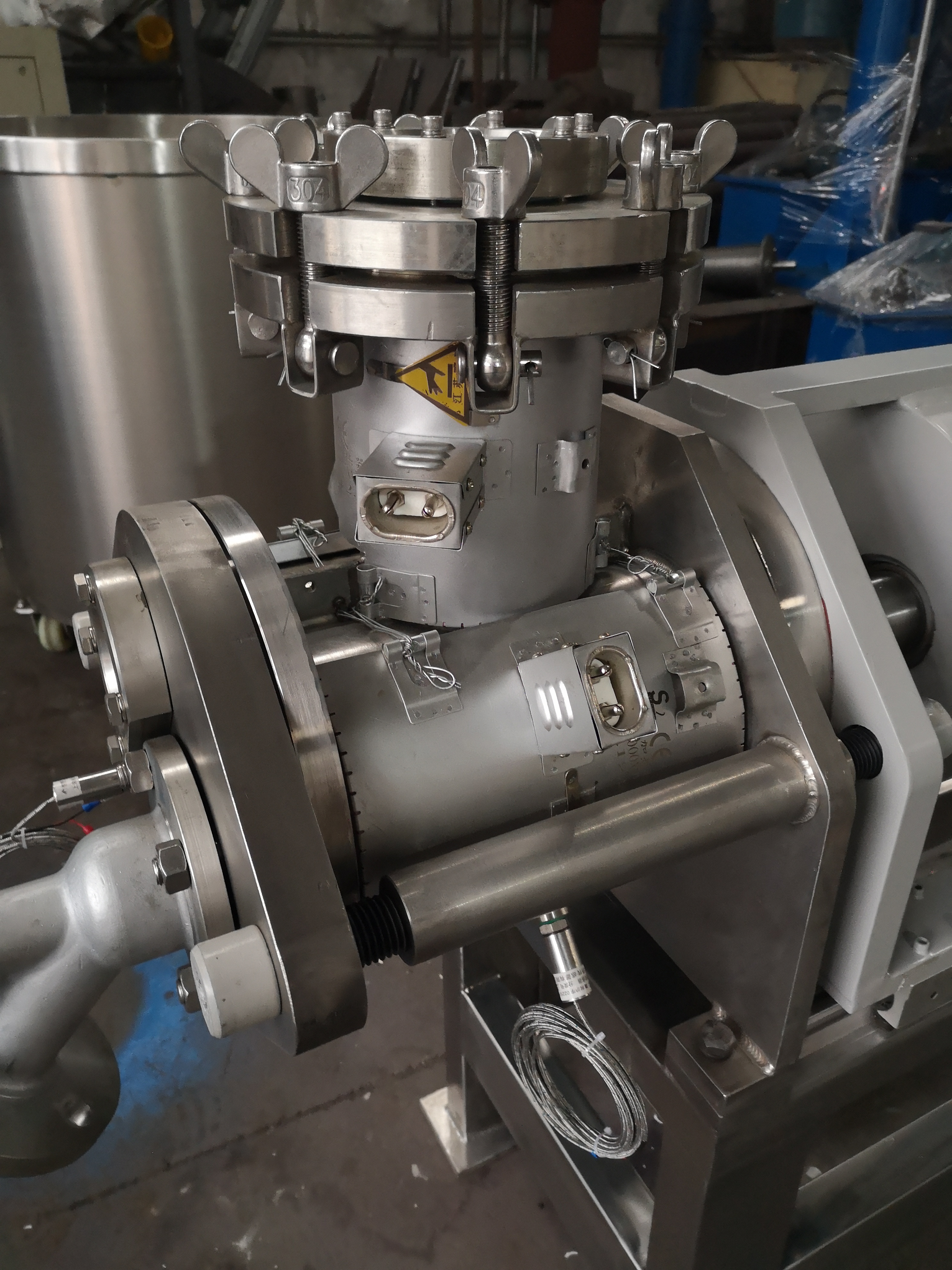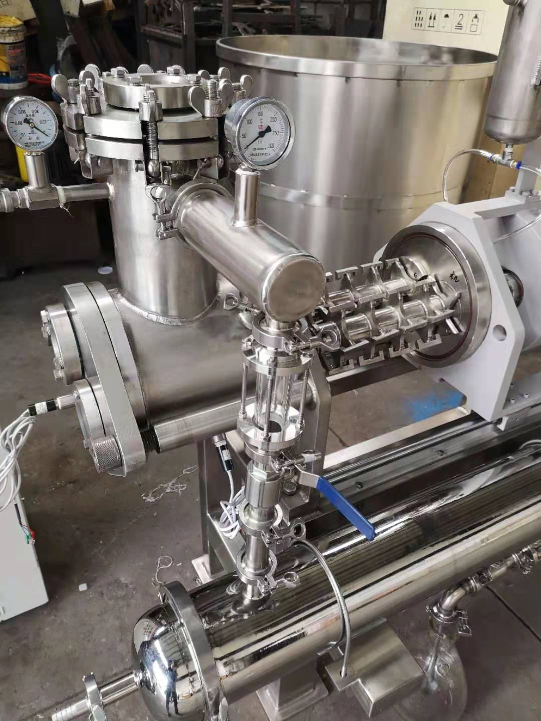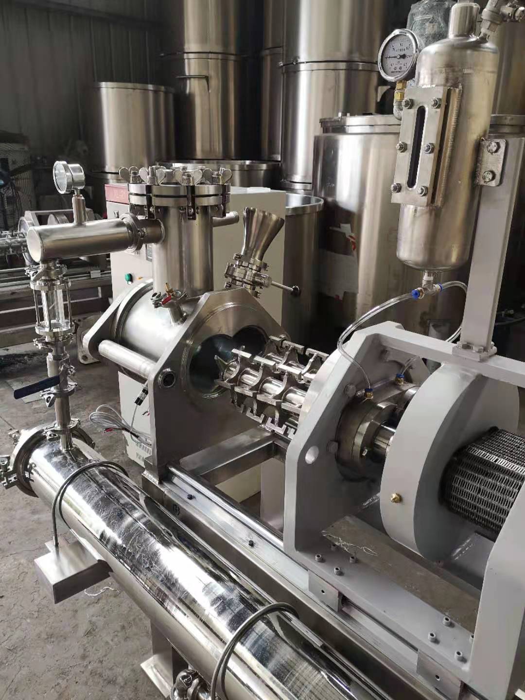 為了適應在真空狀態(tài)下的操作,專門安裝了適用于高粘度物料的齒輪泵式出料器。該出料器直接安裝在主設備上,消除了設備內(nèi)的死角。齒輪泵式出料器在稍微超負荷的條件下工作,以保證物料能連續(xù)地排出,并輸入下一工段進行包裝。
