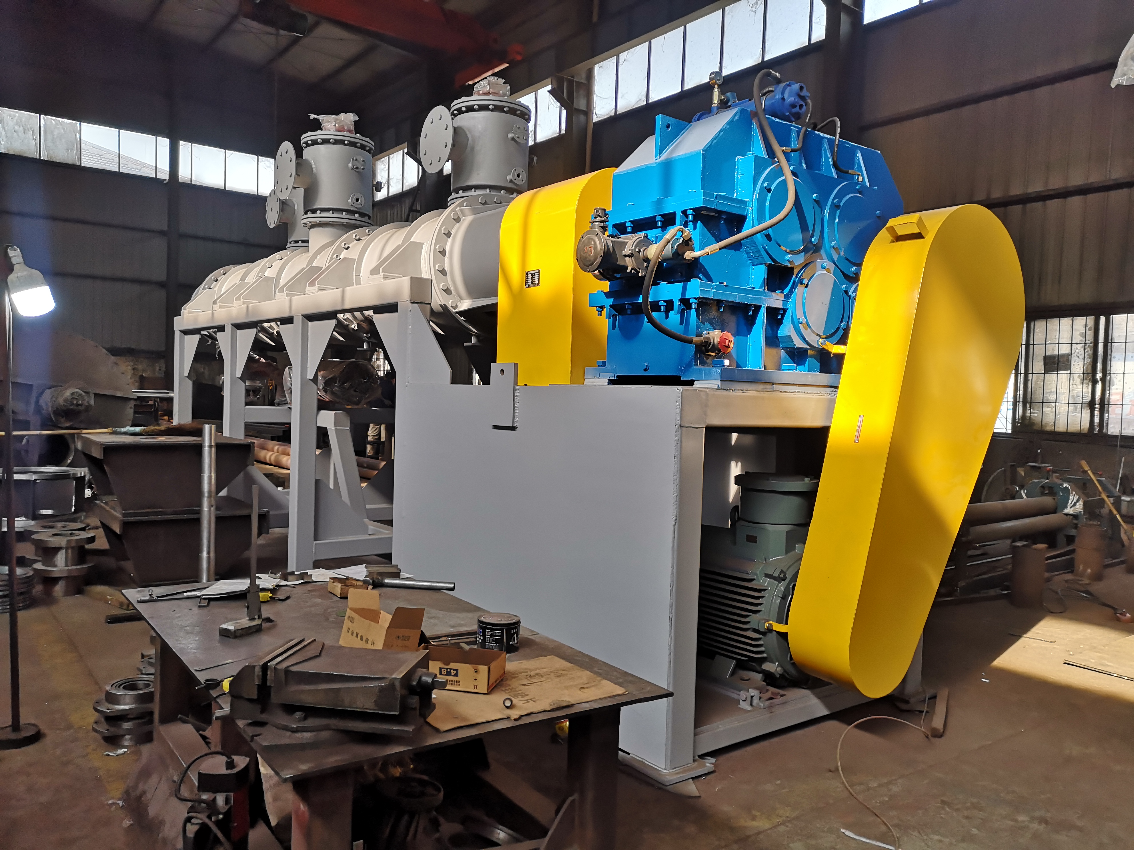 為了適應(yīng)在真空狀態(tài)下的操作,專門安裝了適用于高粘度物料的齒輪泵式出料器。該出料器直接安裝在主設(shè)備上,消除了設(shè)備內(nèi)的死角。齒輪泵式出料器在稍微超負(fù)荷的條件下工作,以保證物料能連續(xù)地排出,并輸入下一工段進行包裝。