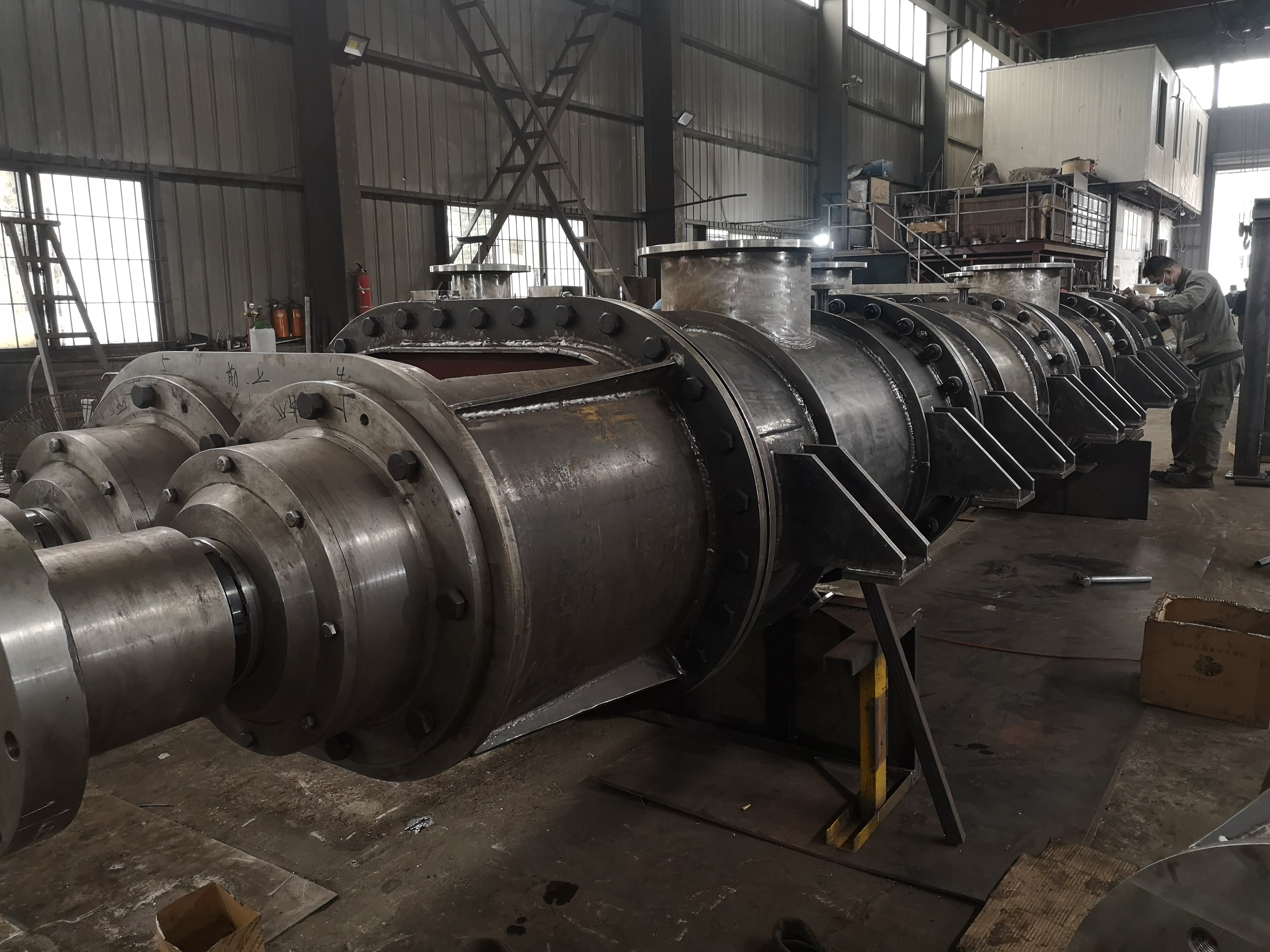 為了盡量增大單位設(shè)備容積的傳熱面積,WZS型自清潔脫揮器的殼體、攪拌軸和攪拌槳都通有導(dǎo)熱介質(zhì)。強力的混合和捏合作用能有效地使物料更快地表面更新,該作用與具有自清潔功能的傳熱面相結(jié)合,從而確保熱、質(zhì)傳遞所需的高表面更新速率。