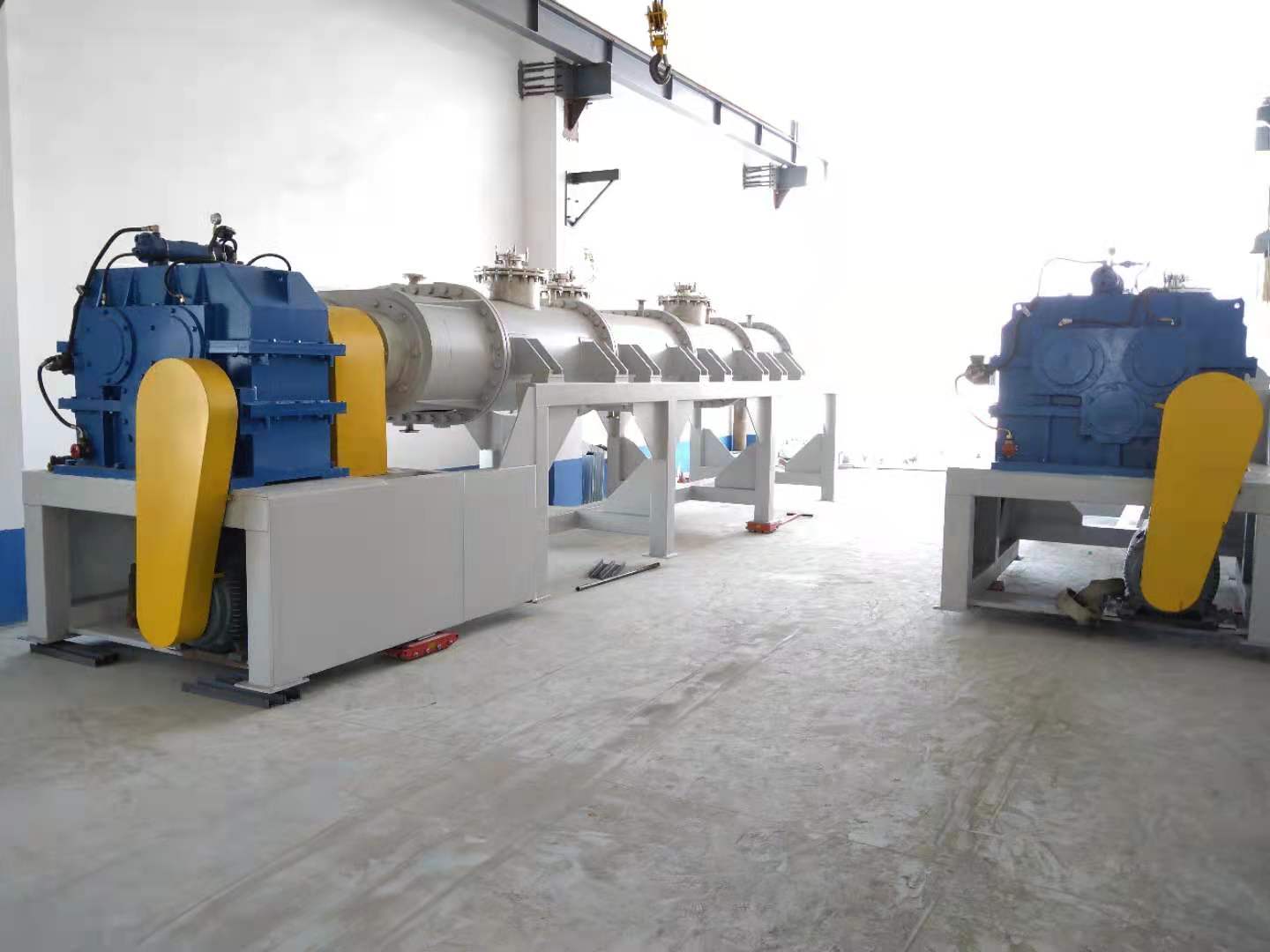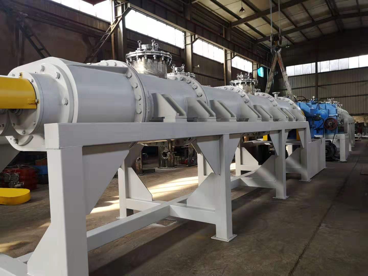 .混合機除夾套有傳熱功能,其主要的傳熱單元還是攪拌軸和攪拌盤,攪拌軸和槳盤中間設計是空心的,能通入0-300℃?zhèn)鳠峤橘|循環(huán),加上攪拌軸的旋轉,單位時間內物料接觸換熱面積增加,使該混合設備具有高效的傳熱能力.是高粘流體物料反應,蒸發(fā),干燥,脫輝的首選裝置。