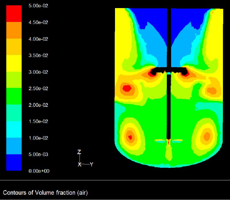 5. 利用下層寬葉仿曲面軸流推進(jìn)槳大排量的循環(huán),將剛剛噴射出來(lái)的氣體,牢牢的壓制在釜體底部,同時(shí)也將釜底催化劑固相物料楊起,達(dá)到完全懸浮的狀態(tài);