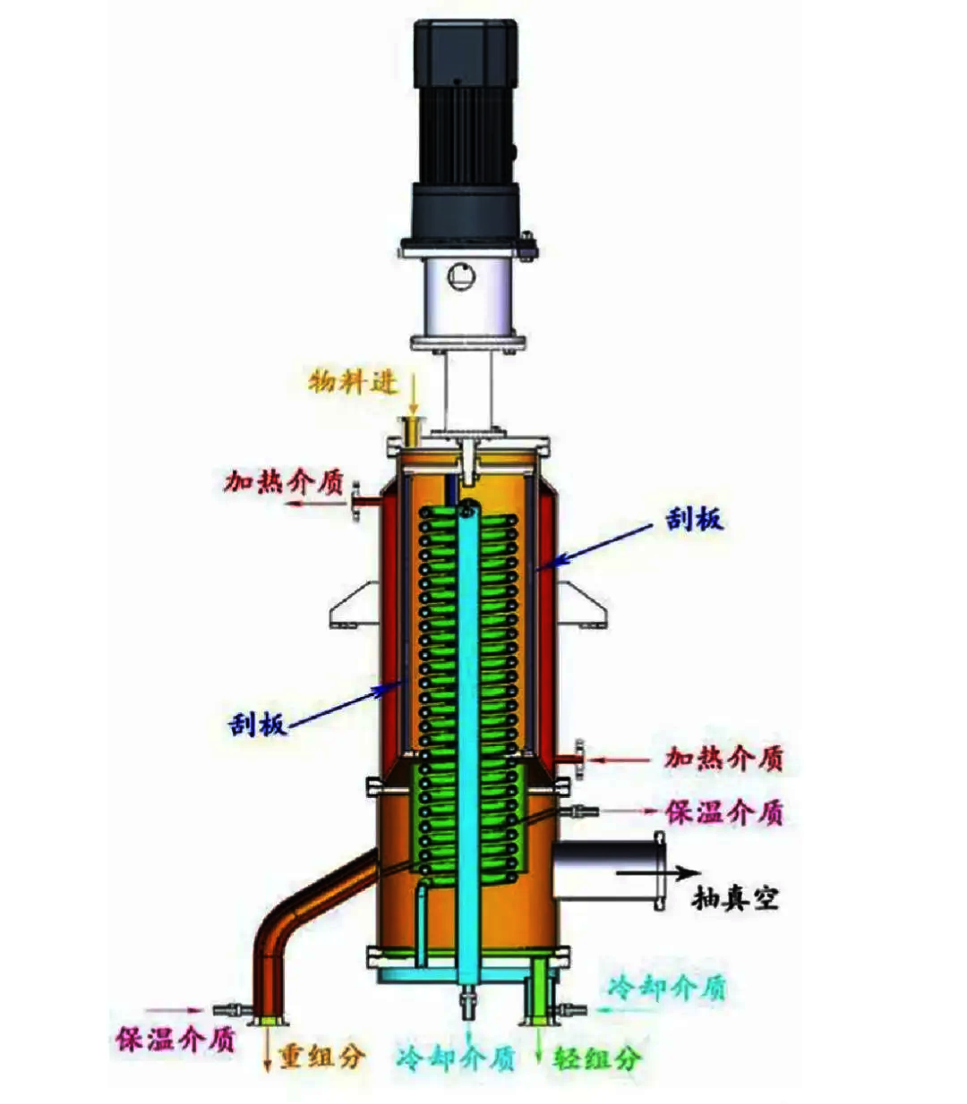 物料從上法蘭蓋進(jìn)入短程蒸餾器,通過(guò)轉(zhuǎn)子上的分配盤將物料連續(xù)均勻的分布到垂直的筒體加熱面上,物料靠重力下降的同時(shí),被旋轉(zhuǎn)的刮膜裝置在加熱面強(qiáng)制形成薄的湍流狀液膜。