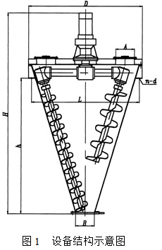 DSH型混合機(jī)結(jié)構(gòu)如圖1。主要由錐體、帶電機(jī)減速機(jī)、傳動(dòng)機(jī)構(gòu)、螺旋及出料閥等部件組成。在錐體內(nèi)安裝兩根螺旋,螺旋采用非對(duì)稱結(jié)構(gòu)。長螺旋沿錐壁安裝,短螺旋靠近錐體中心部位安裝,且螺旋直徑比長螺旋大。使用時(shí),兩螺旋作自轉(zhuǎn)的同時(shí)又沿錐壁作公轉(zhuǎn),即行星運(yùn)動(dòng)。該機(jī)使用特特征: